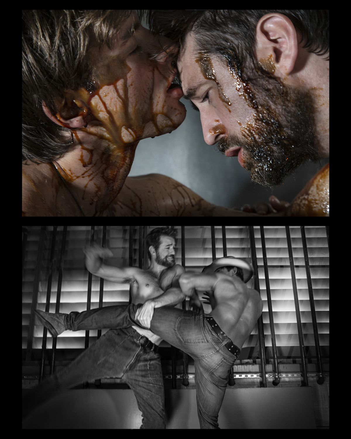 Actors Fabian Arnold and Justin Powell from the film Big Rage sharing a heated kiss and kick