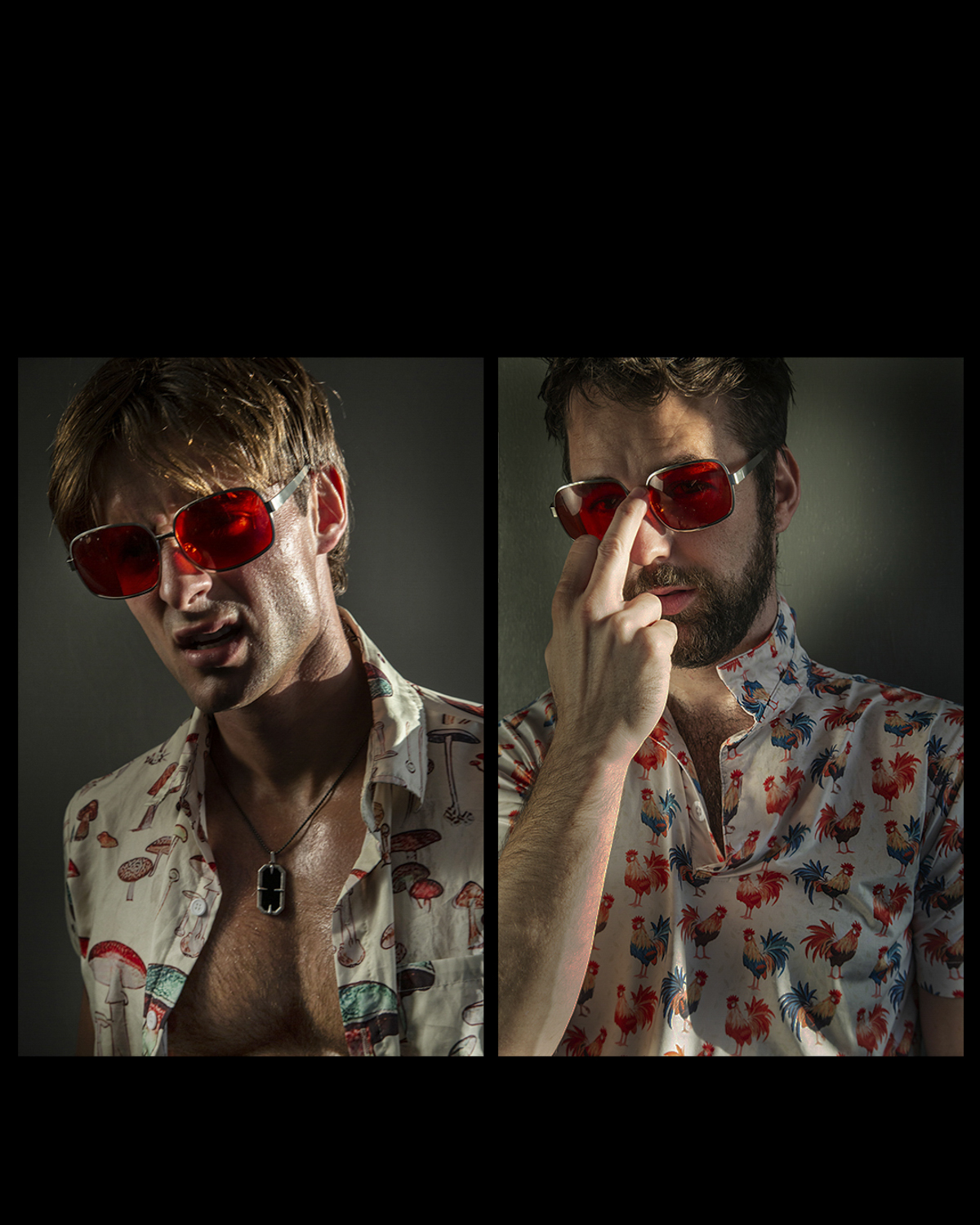 Actors Fabian Arnold and Justin Powell from the film Big Rage showing off a playful side in bright prints and tinted shades