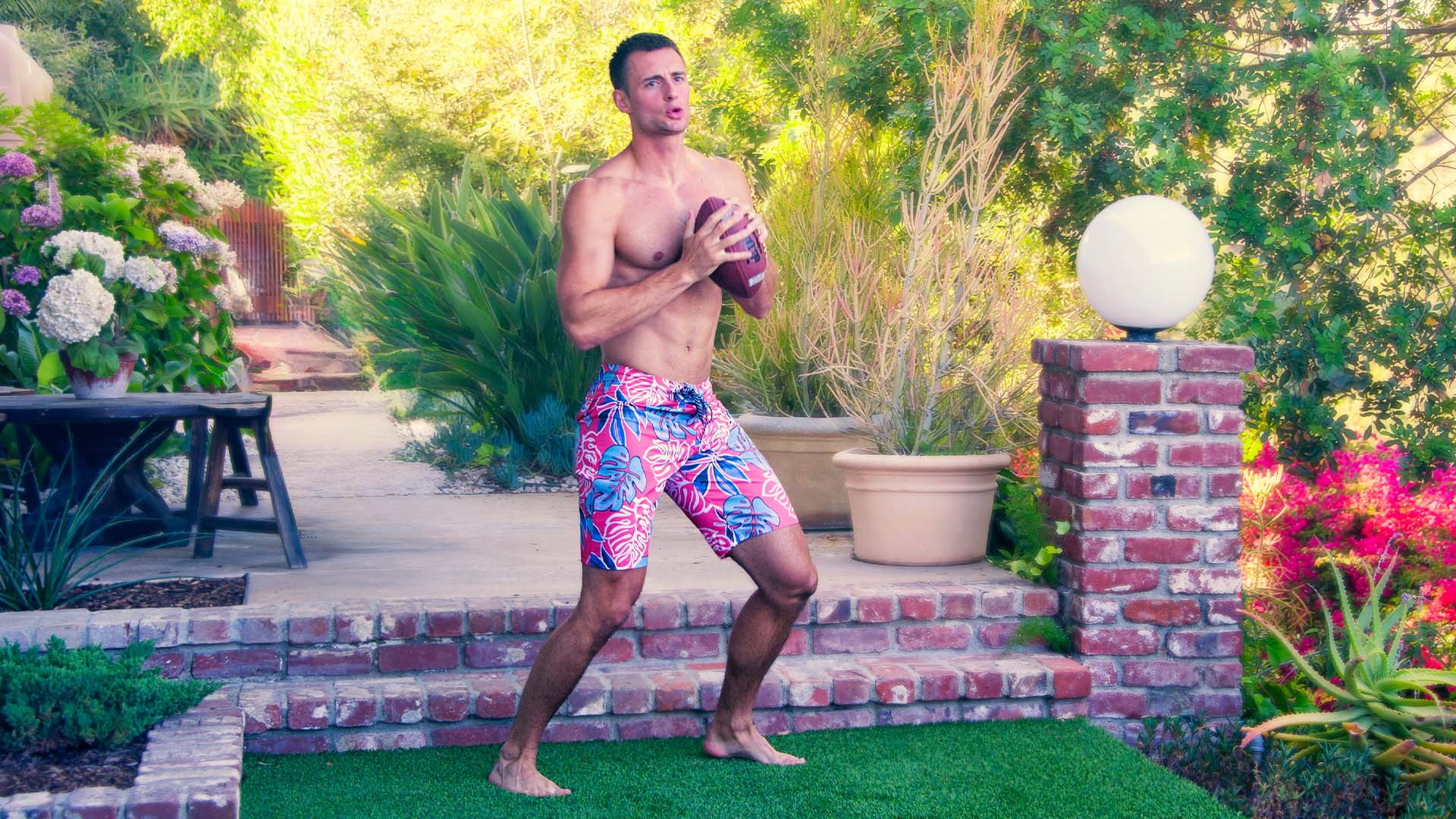 Fabian Arnold combines athleticism and style, playing football in his Hurley boardshorts.