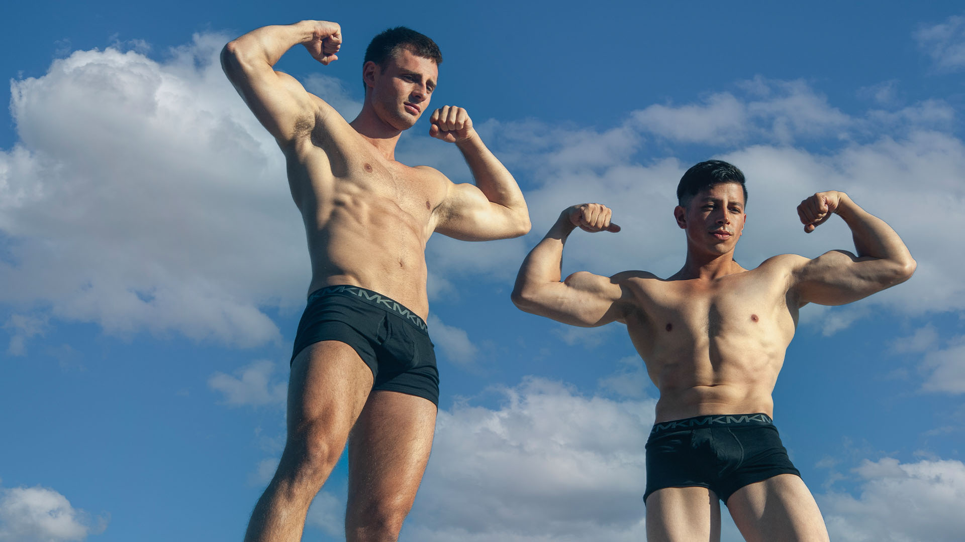 Fabian Arnold and Rich Forbes stand boldly against the sky, their Michael Kors briefs defining style.