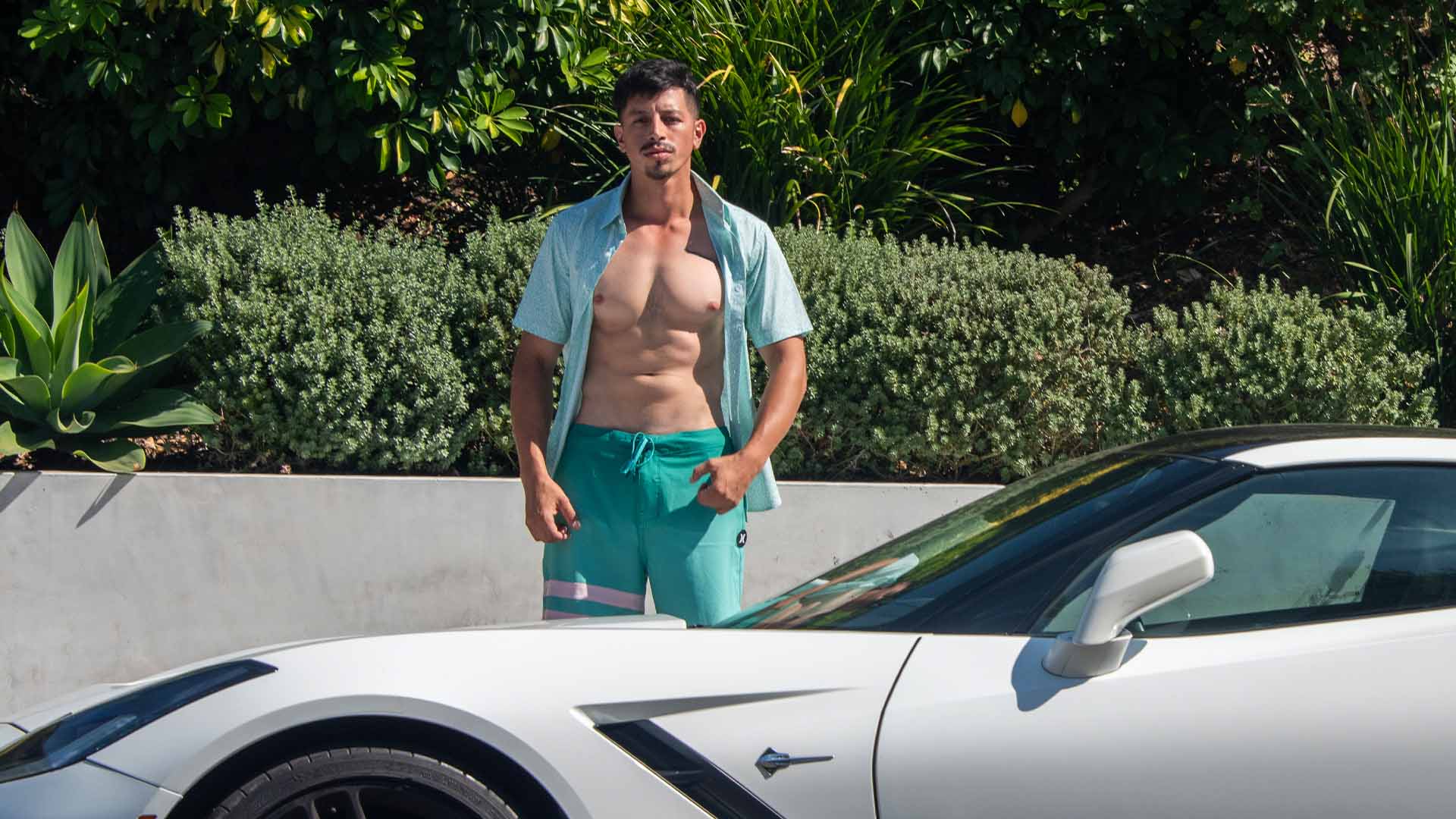 Rich Forbes turns heads with his effortless style in a Hurley shirt and boardshorts combo.