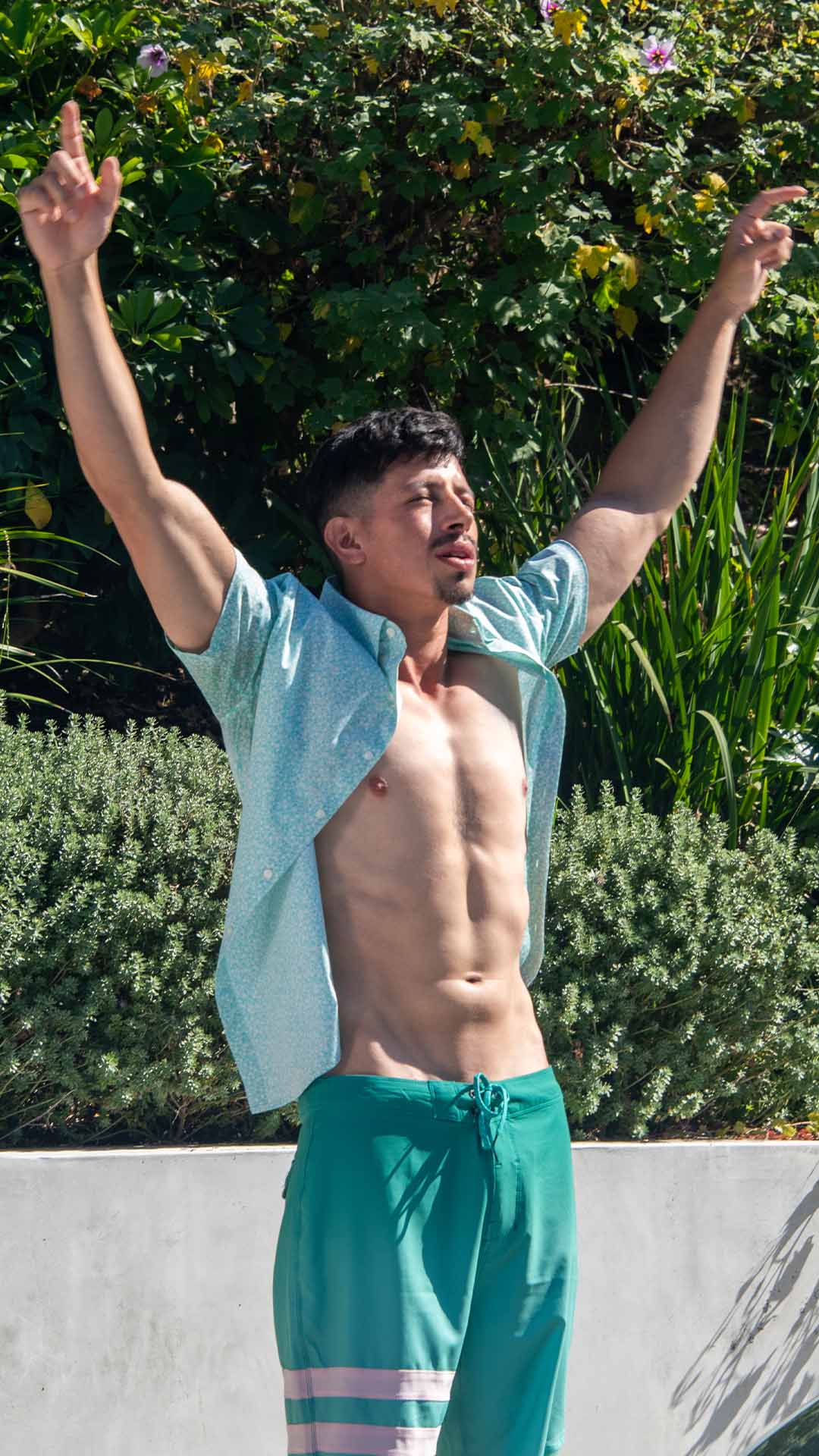 Rich Forbes’ Hurley ensemble, featuring a shirt and boardshorts, screams comfort and style.