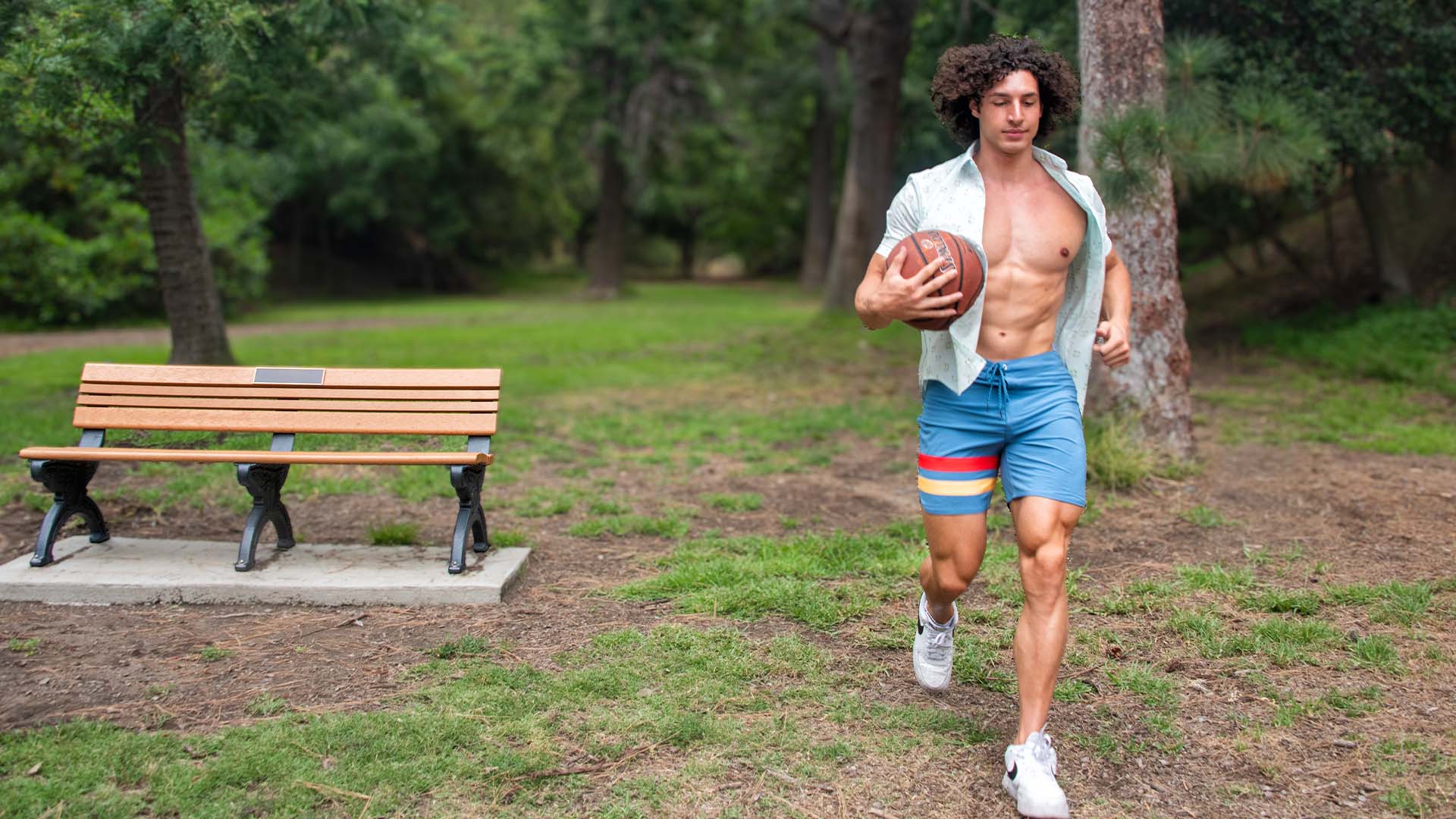 Charlie Santana is in a park, wearing Hurley shorts and preparing to play basketball, looking focused and athletic.