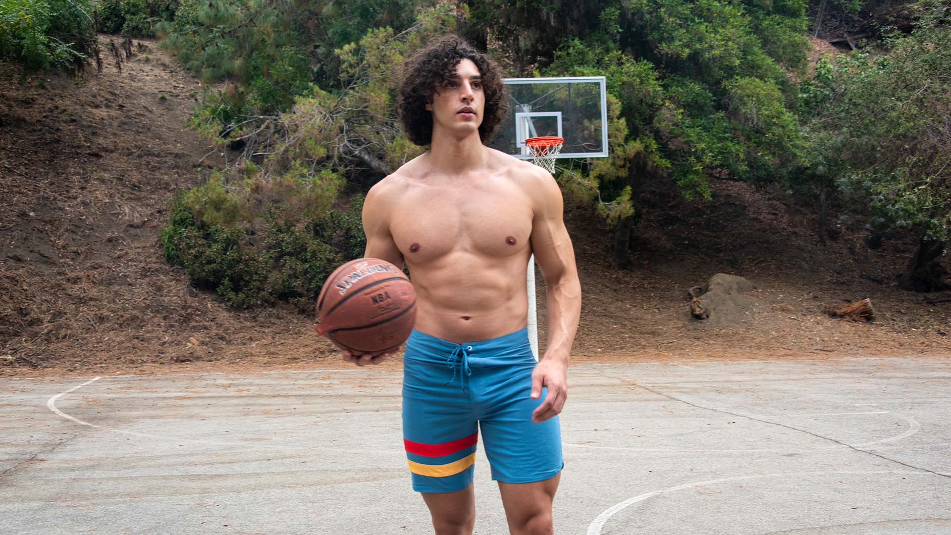 In the lush setting of a tree-filled park, Charlie Santana, wearing Hurley shorts, sprints across the basketball court.