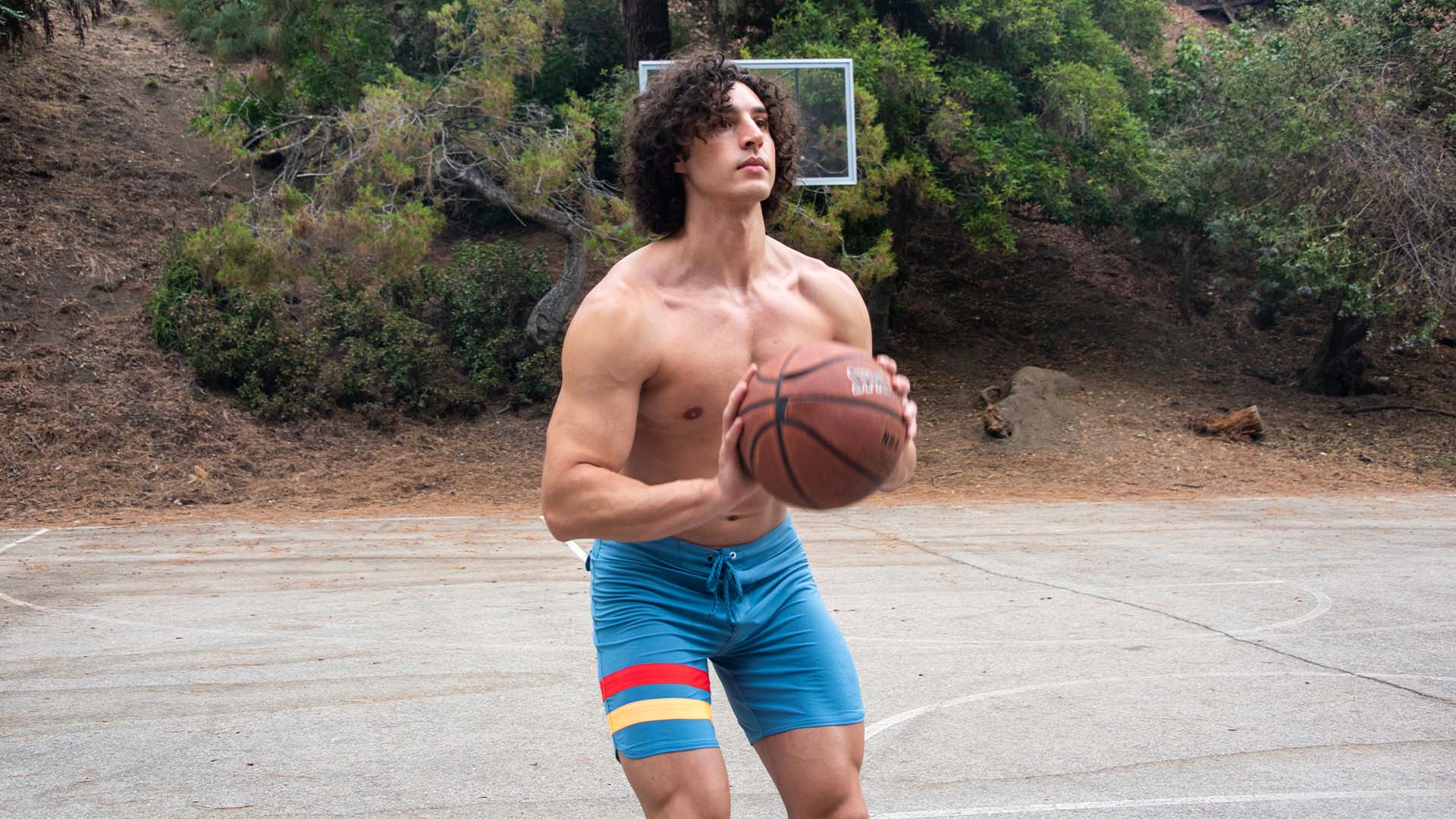 On a basketball court in the heart of a tree-canopied park, Charlie Santana in Hurley shorts trains with dedication.