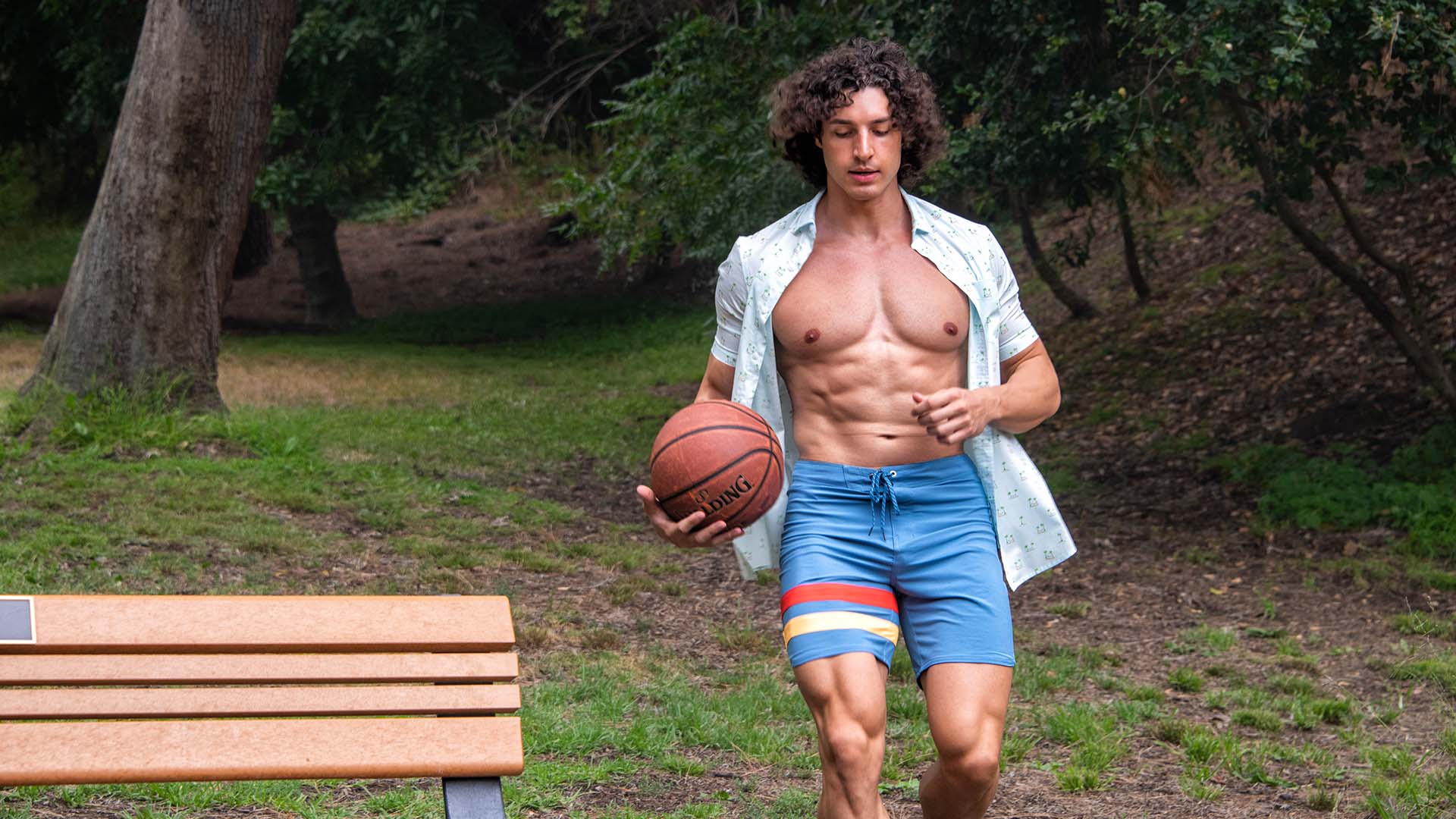 Amidst green park scenery, Charlie Santana, wearing Hurley shorts, enthusiastically prepares for a challenging basketball game.