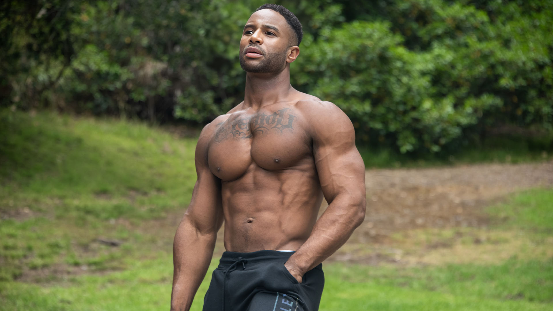 In the park, Antony Ware, dressed in Hurley sweatpants, engages in warm-up exercises, readying himself for basketball practice.