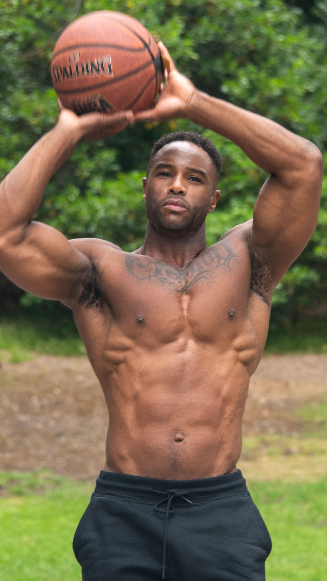 Antony Ware, his muscles accentuated by his Hurley sweatpants, positions himself on the park’s basketball court for a dynamic workout.