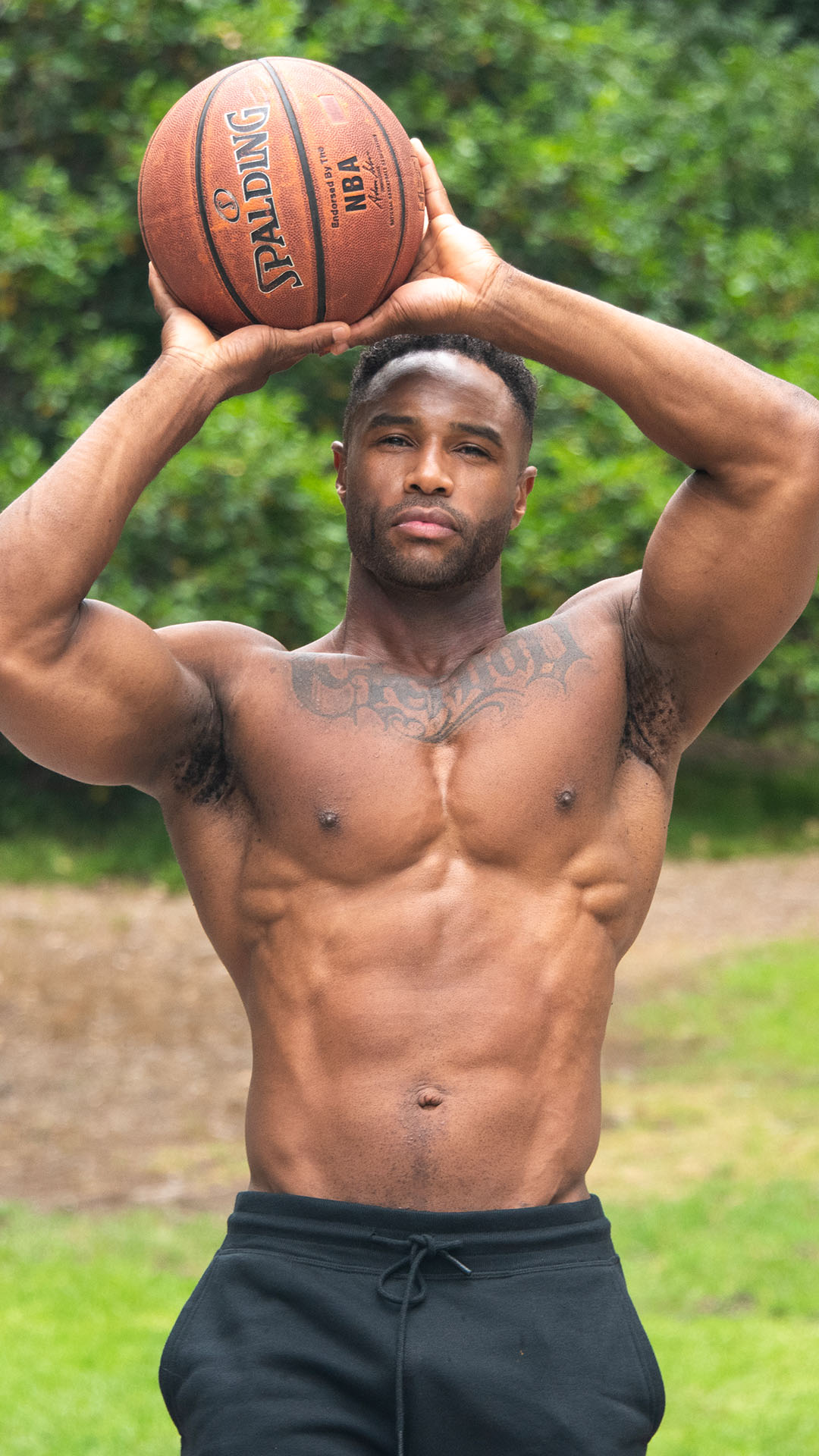 Antony Ware, with his impressive muscular physique, is in the park, dressed in Hurley sweatpants, primed for a basketball workout.