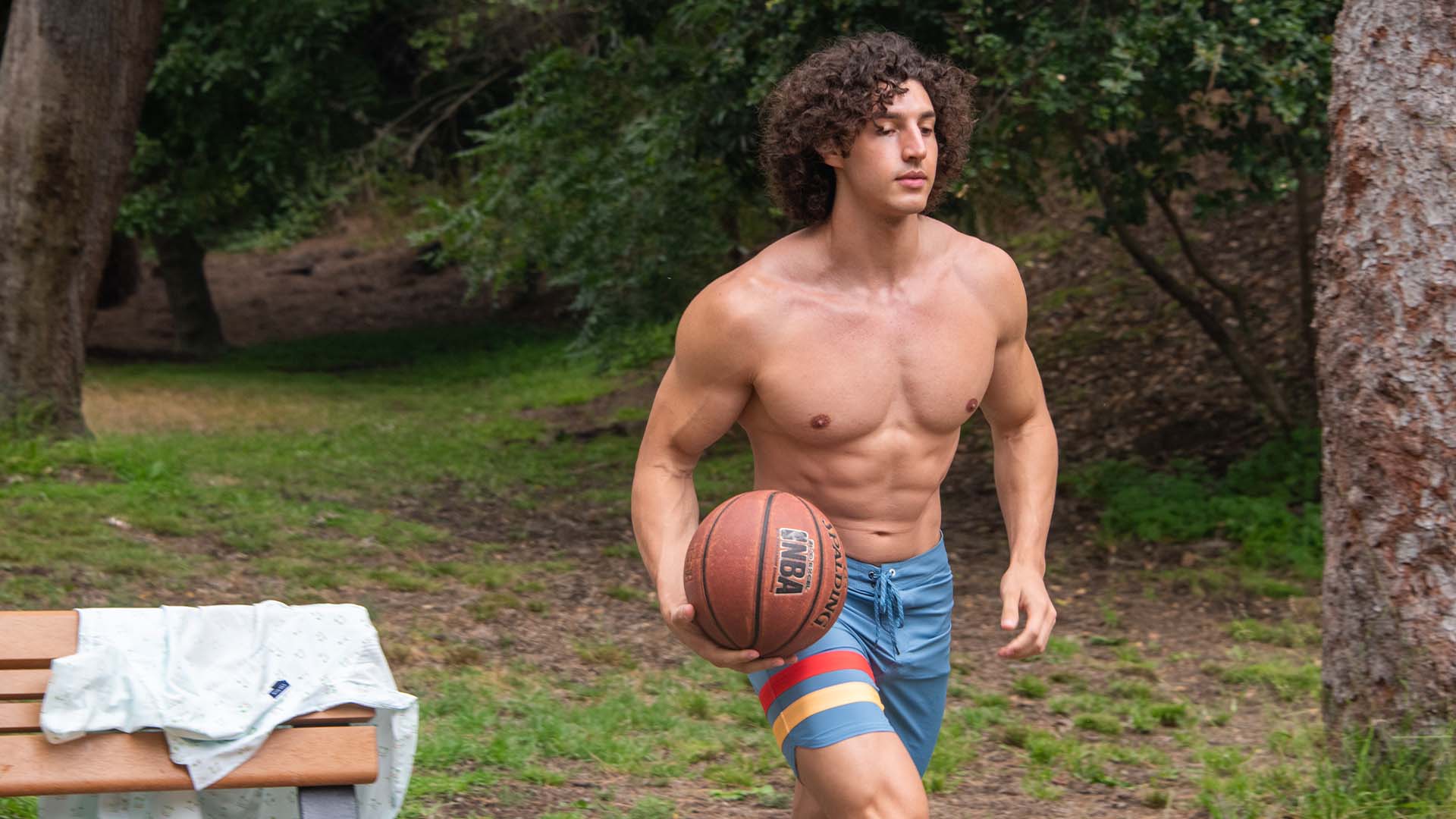 Charlie Santana, in Hurley shorts, is set against a backdrop of towering trees in a park, readying for basketball.