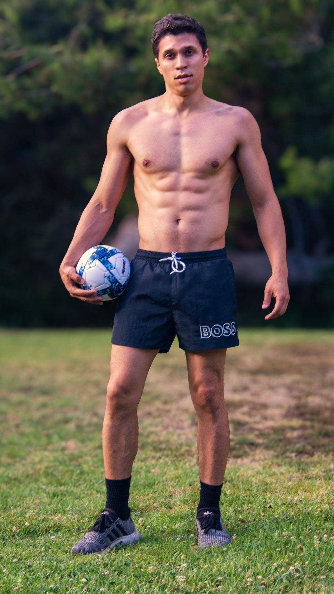 On the green lawns of the park, Mathew LaSpina, in Hugo Boss shorts, practices his soccer moves with finesse.