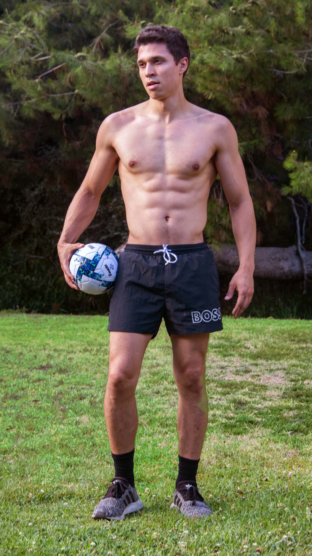 Amidst the lush greenery of the park, Mathew LaSpina, wearing Hugo Boss shorts, practices his soccer techniques with flair.