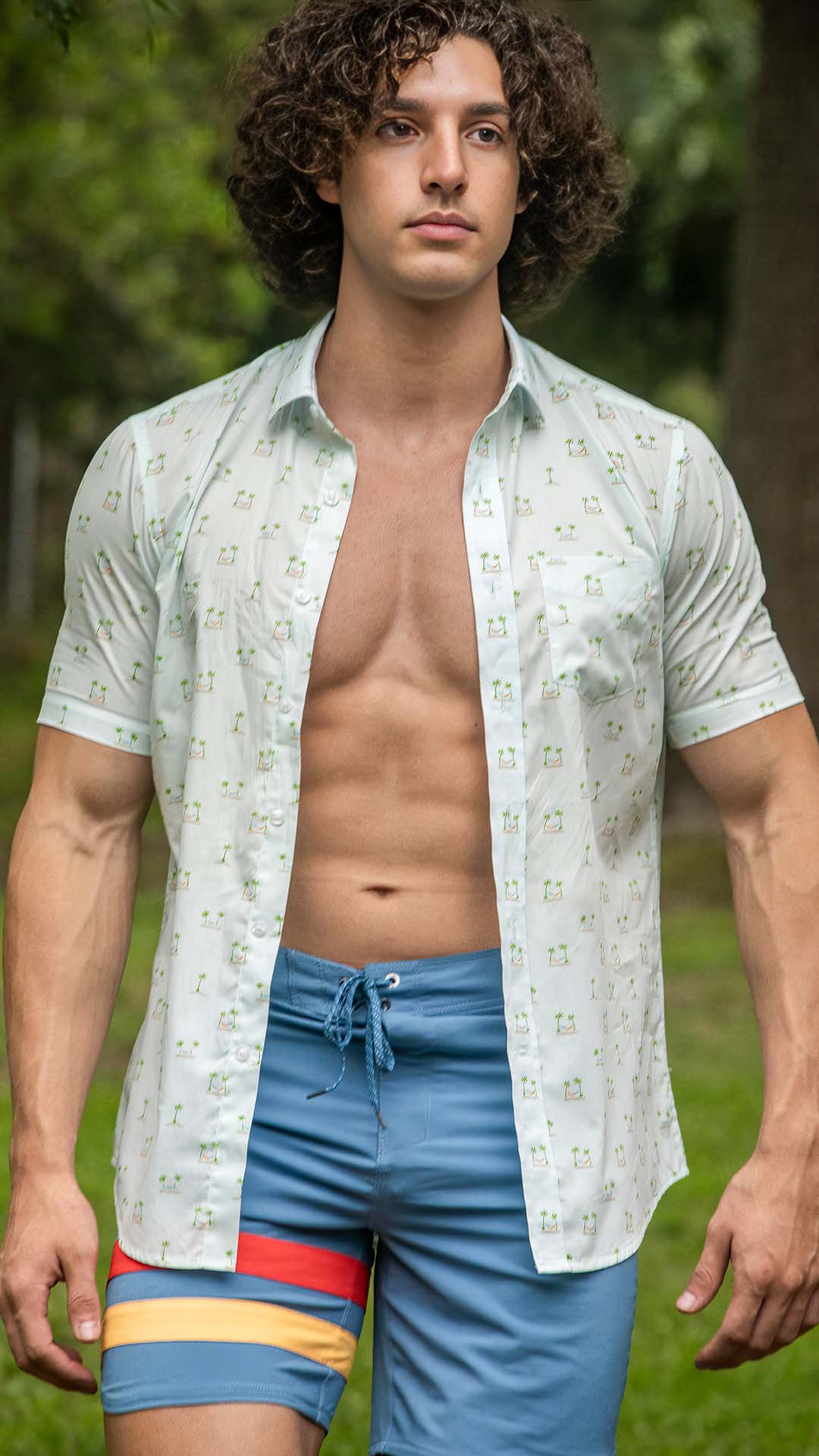 In a tranquil park setting among tall trees, Charlie Santana, sporting Hurley shirt and shorts, focuses on his basketball game prep.