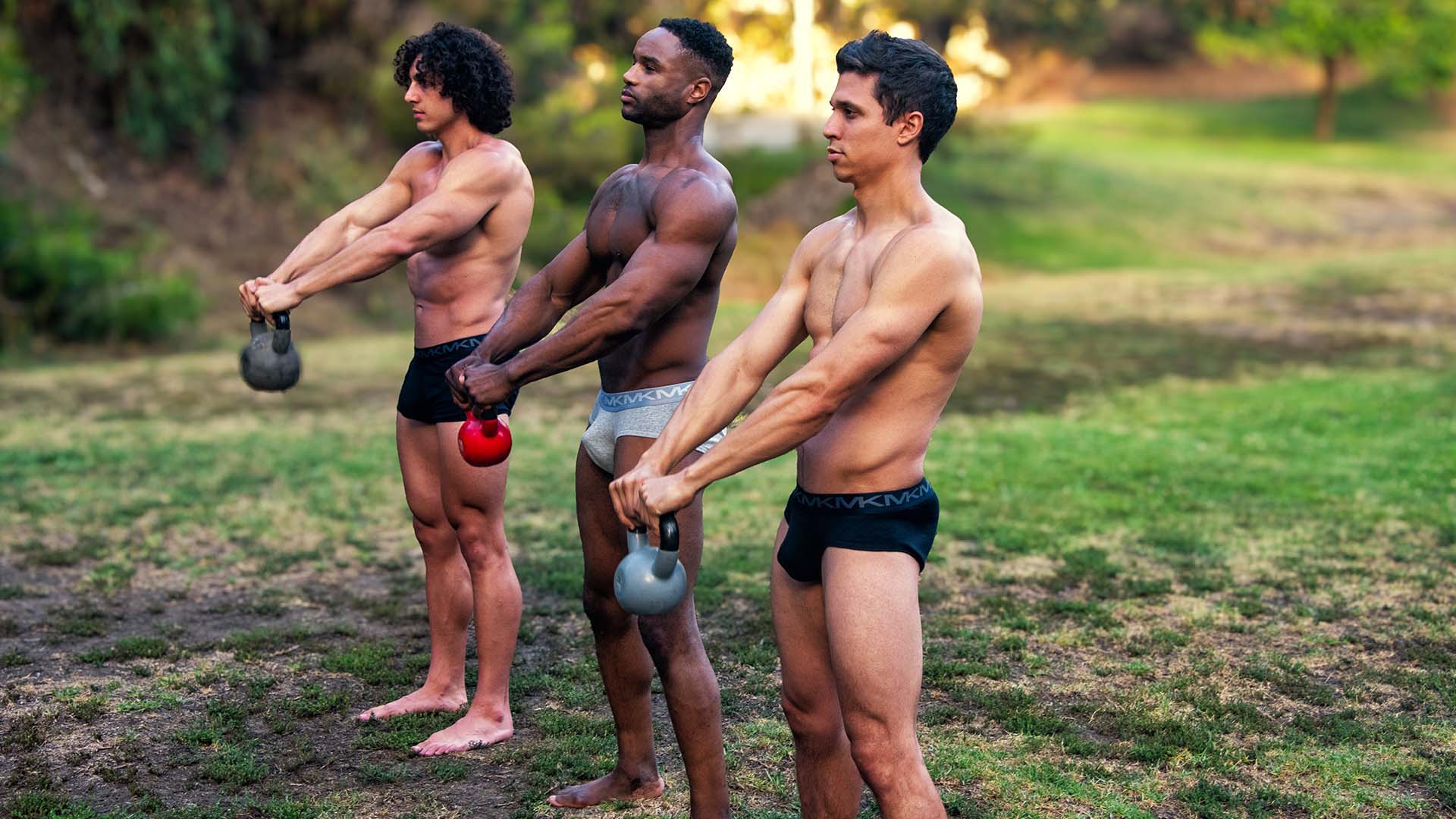Surrounded by greenery, Antony Ware, Charlie Santana, and Mathew LaSpina push their limits in a challenging kettlebell session in the park.