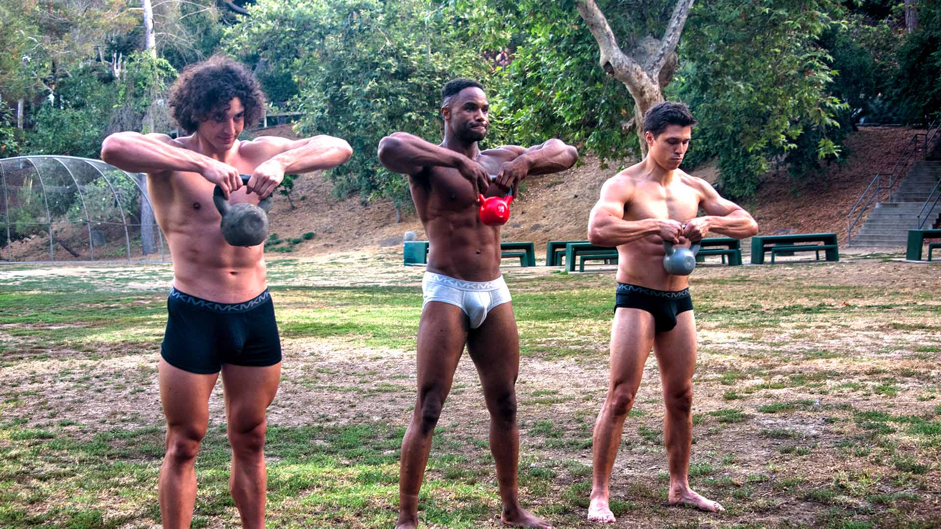 Antony Ware, Charlie Santana, and Mathew LaSpina train in the park with kettlebells, focusing on strength and endurance exercises.