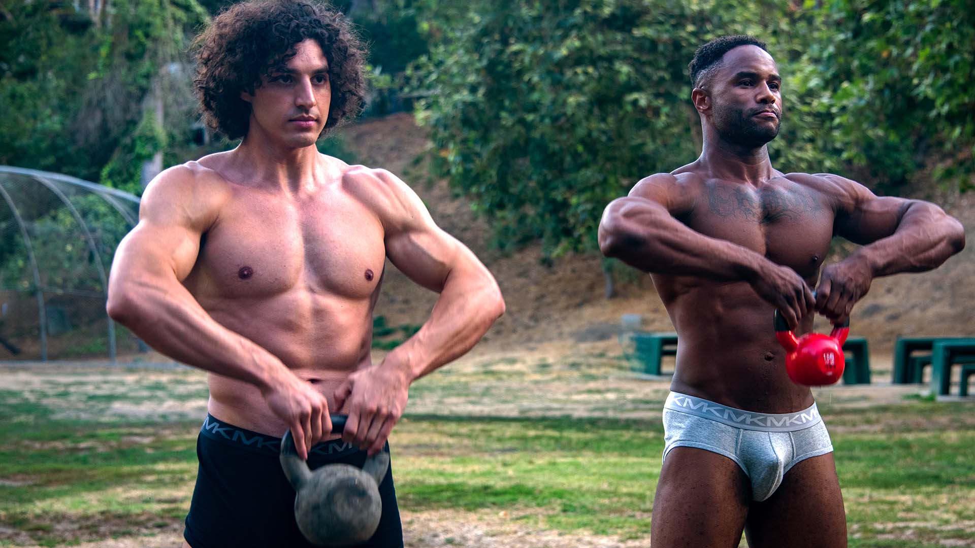 Antony Ware and Charlie Santana engage in a focused kettlebell training session in the park, emphasizing strength and endurance exercises.