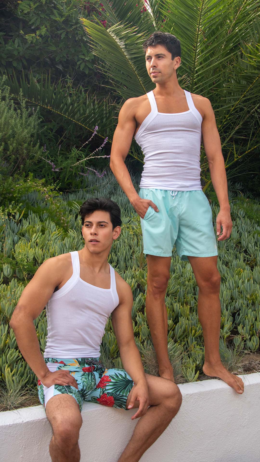 Against a backdrop of greenery, Anthony in his Hurley shorts and Andrew in Boss attire showcase their distinct styles, blending seamlessly with the wild.