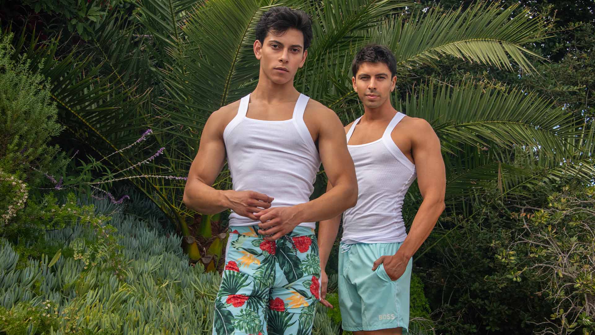 Anthony and Andrew, each in their branded board shorts, stand ready for jungle adventures, embodying the essence of outdoor lifestyle.