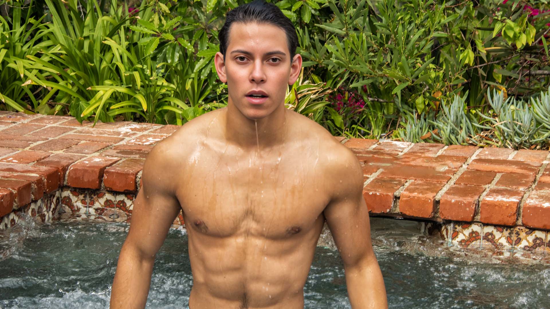 In the steamy ambiance, Anthony, soaked and serene, showcases his Hurley board shorts, his posture relaxed yet poised, embodying leisure and style in the warmth.