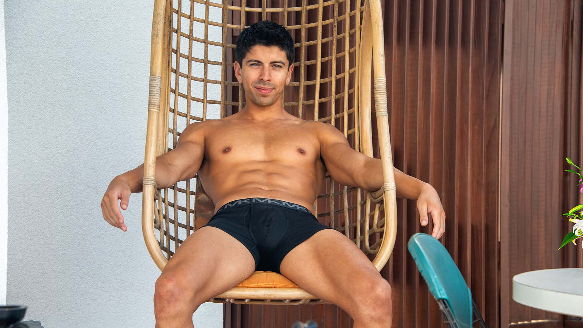 Andrew Granillo lounges in a wicker hanging chair, posing gracefully in Michael Kors briefs, his relaxed demeanor a picture of elegance and comfort.