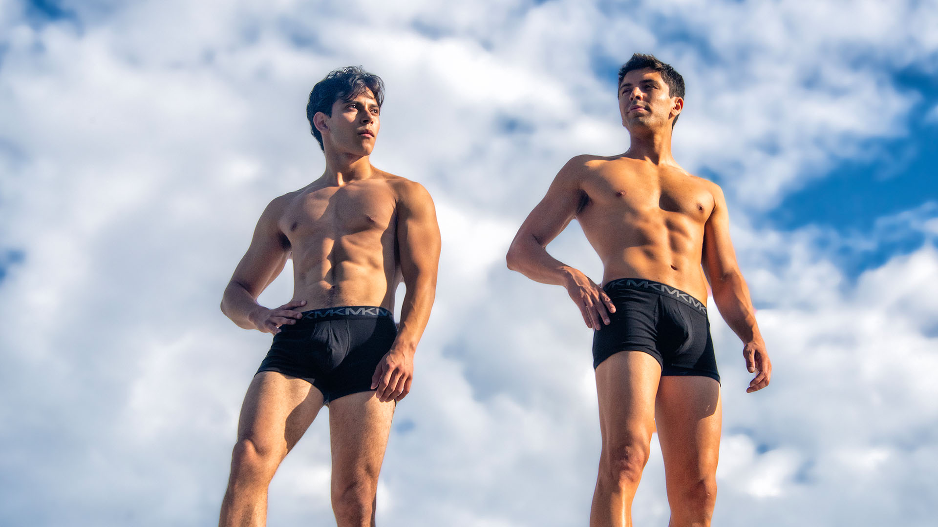 High above, where the sky turns a rich shade of blue, Anthony and Andrew capture the essence of luxury in their Michael Kors briefs, posing with grace.