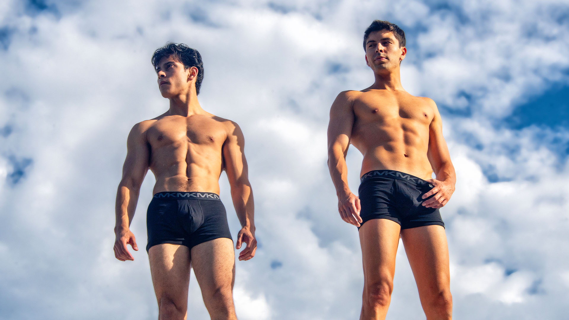 The vast expanse of the deep blue sky serves as the perfect canvas for Anthony Garcia and Andrew Granillo, whose Michael Kors briefs symbolize refined elegance.