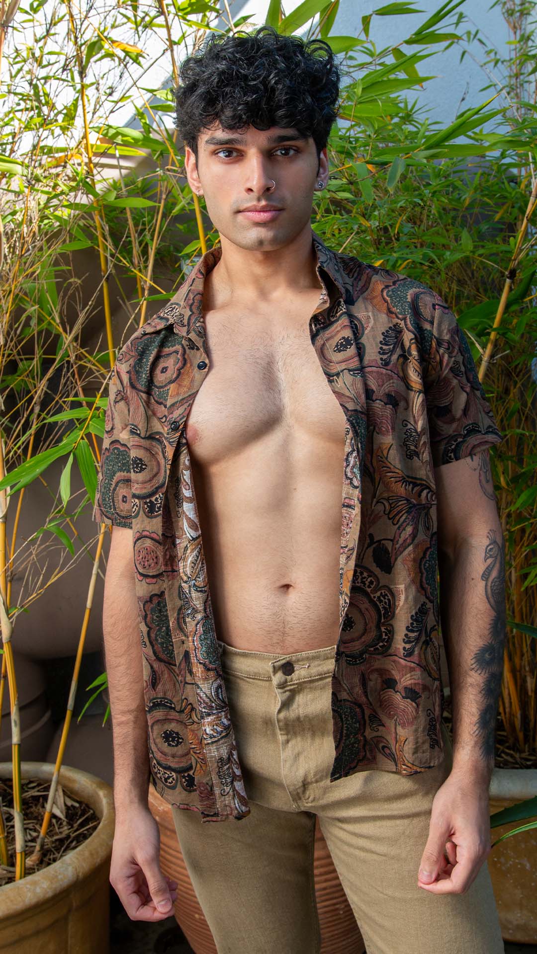 Tejas Mahabaleshwarkar’s confident pose, open shirt, and toned body create a captivating image set against vibrant, natural bamboo.