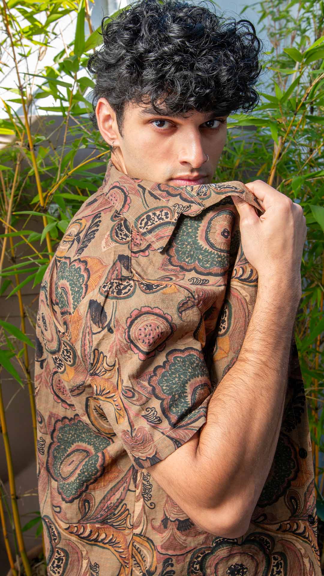 Tejas Mahabaleshwarkar’s intense stare and stylish patterned shirt, set against vibrant bamboo, create a captivating image of boldness and natural elegance.