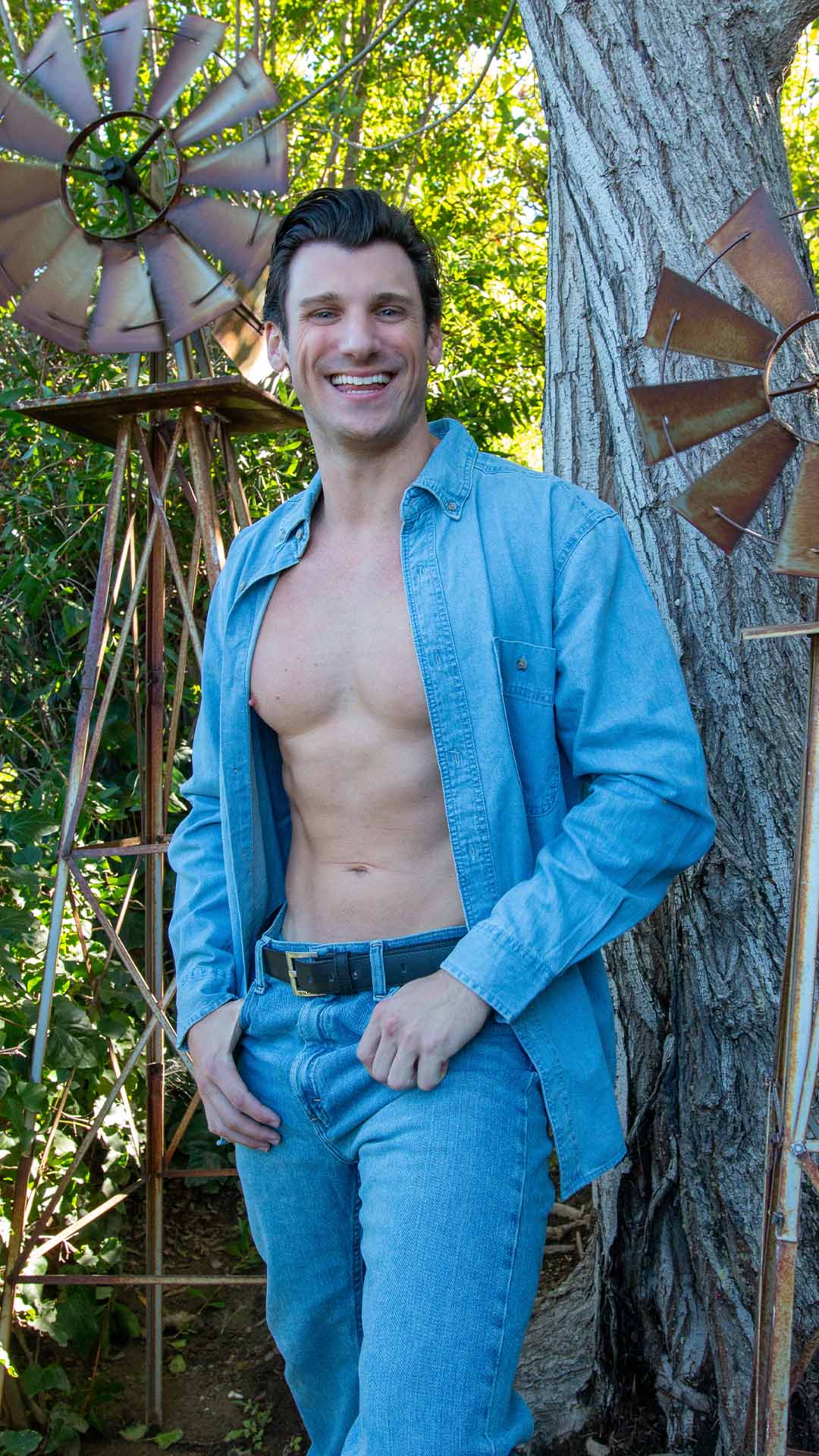 Flashing a bright smile, Gage Robinson stands confidently in an open denim shirt, with windmills and trees creating a charming, rustic setting.