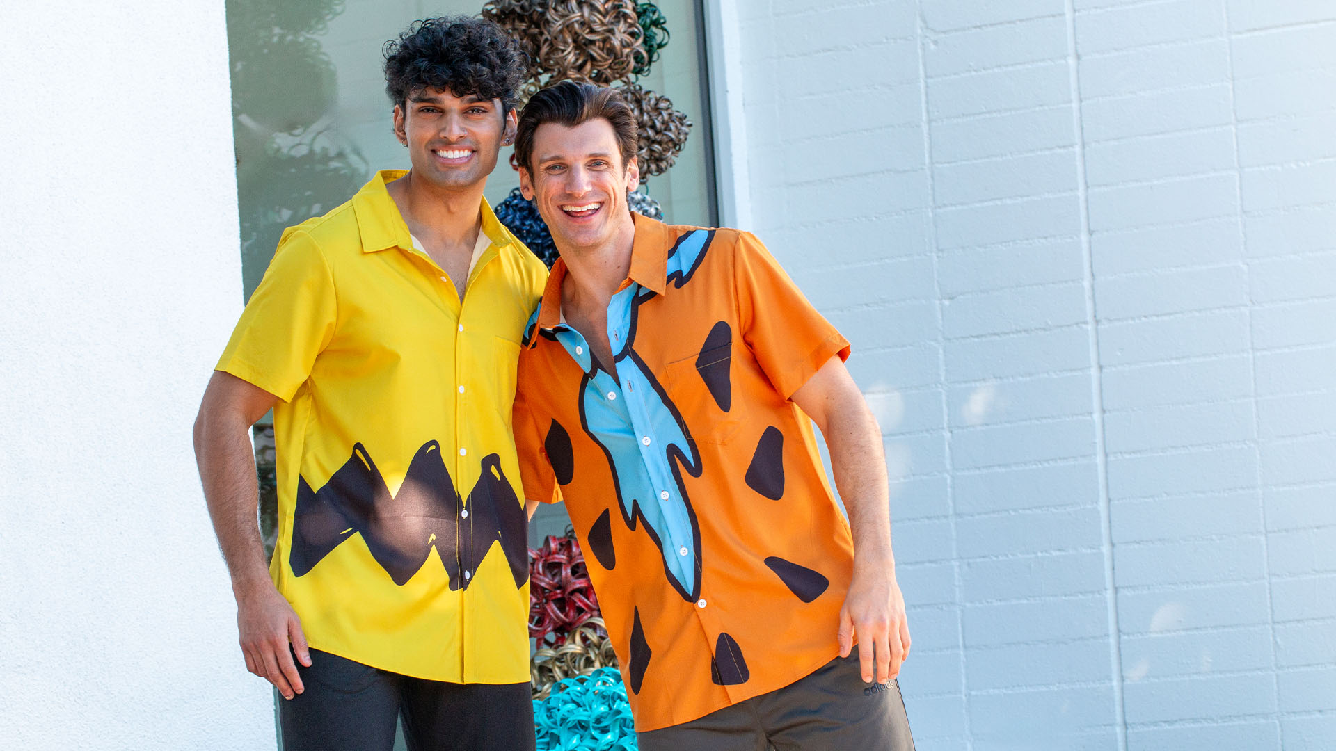Tejas Mahabaleshwarkar and Gage Robinson share a cheerful moment in their colorful, cartoon-themed shirts, standing together against a vibrant backdrop.
