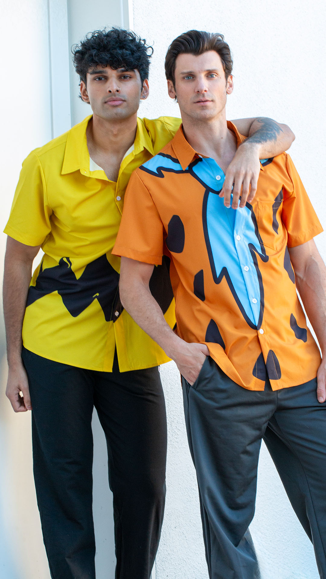Tejas Mahabaleshwarkar leans casually against Gage Robinson, both models looking stylish and relaxed in their vibrant, cartoon-inspired shirts.
