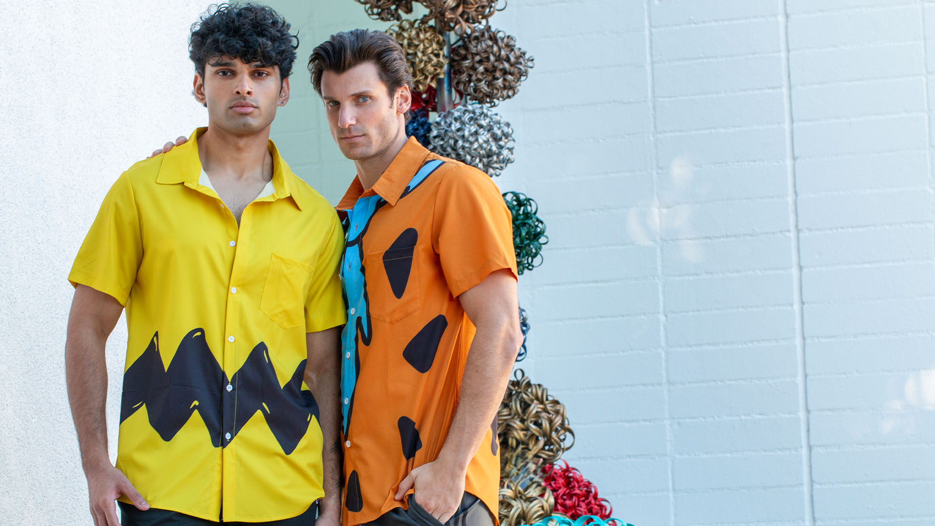 Sharing a moment of laughter, Tejas Mahabaleshwarkar and Gage Robinson look vibrant and lively in their cartoon-themed shirts.