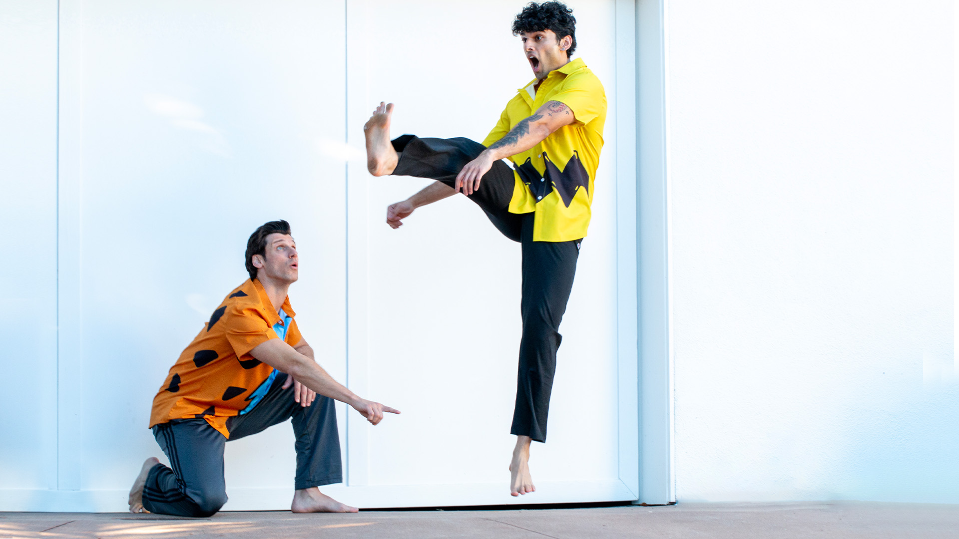 Tejas Mahabaleshwarkar demonstrates a high kick while Gage Robinson points in awe, both models wearing bold, cartoon-inspired shirts that exude energy and humor.