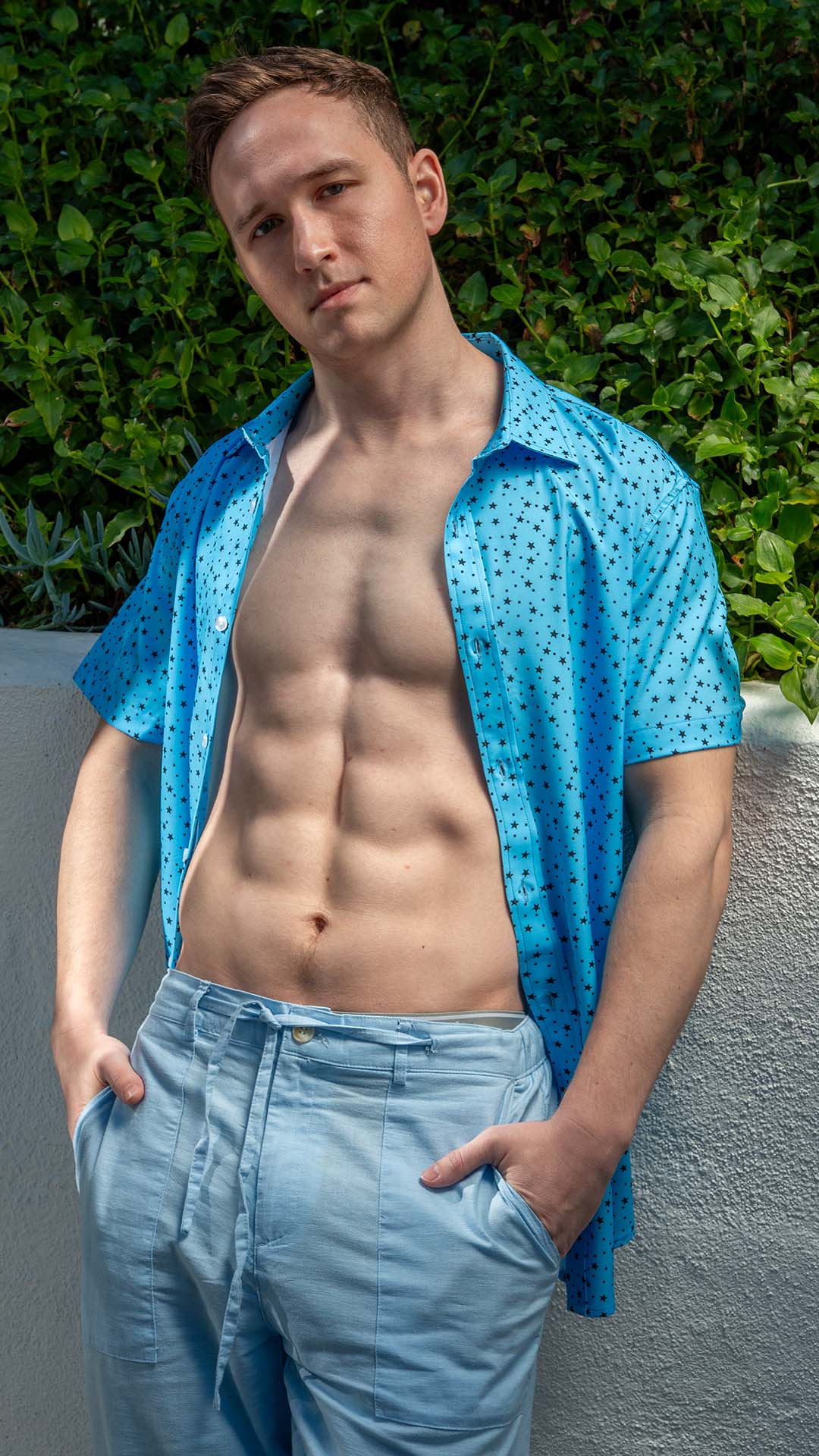 With a serene garden background, Ben Russell poses against a wall, the greenery complementing his casual blue outfit.