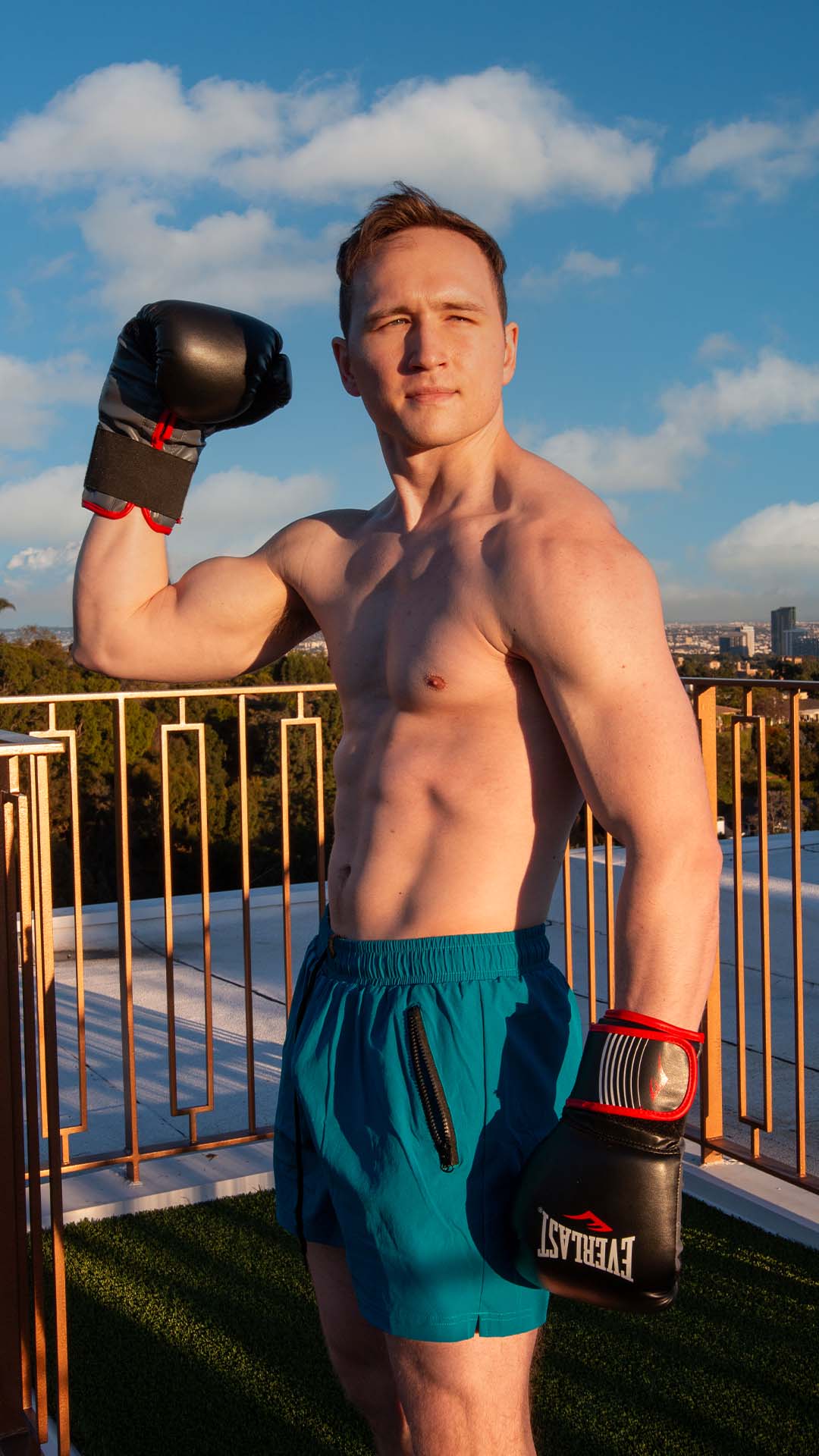 Displaying his muscular build, Ben Russell raises his boxing glove in a victorious pose, with the city skyline beautifully framing the background.