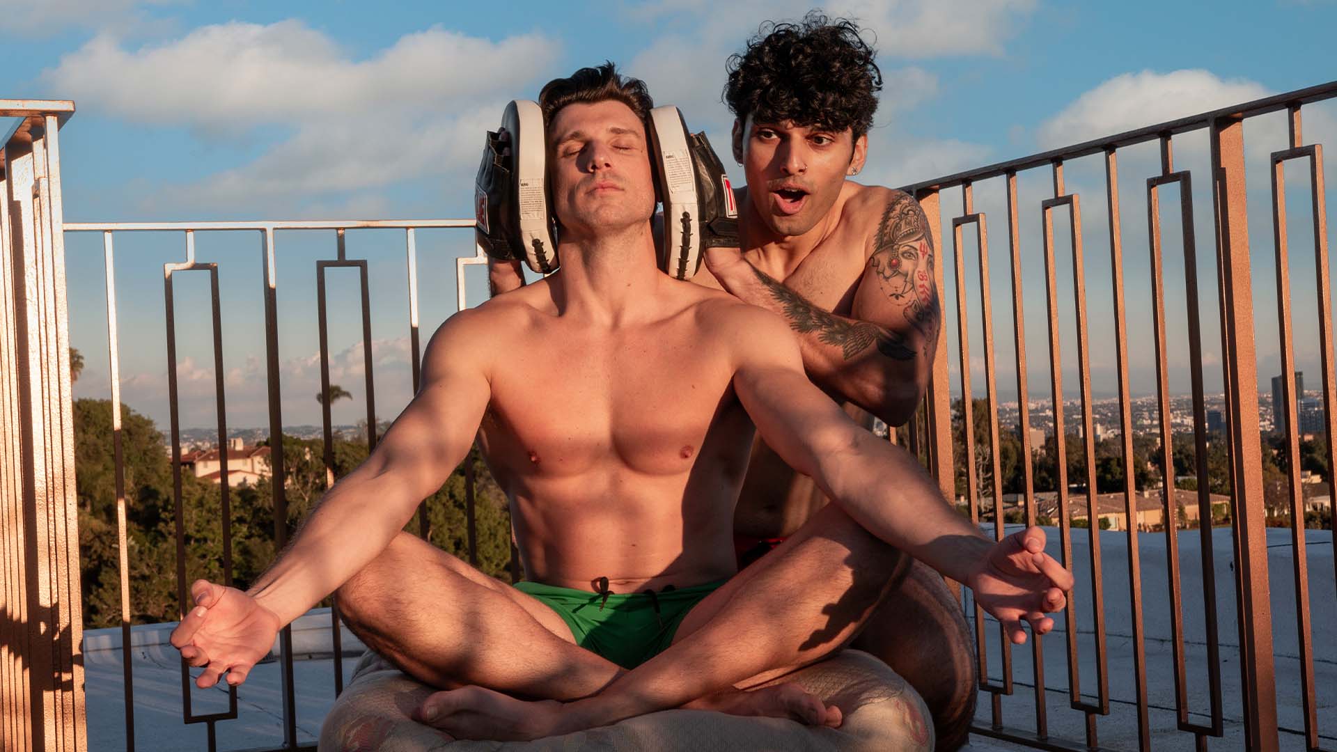 Gage Robinson meditates with his eyes closed while Tejas Mahabaleshwarkar playfully places boxing mitts on his head. They share a light-hearted moment on a rooftop with a scenic view.