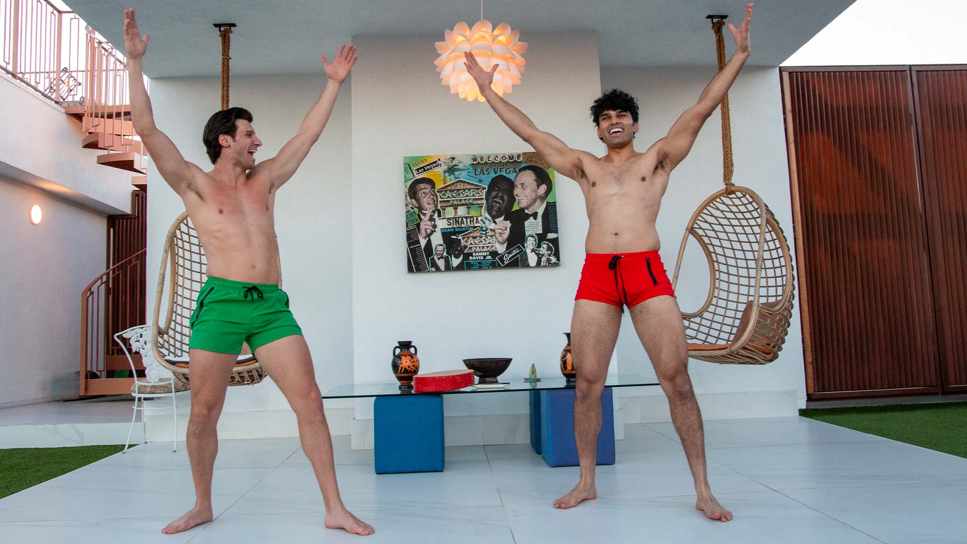 Gage and Tejas stand side by side, arms raised high in celebration, creating a vibrant and uplifting indoor scene with eclectic decor in the background.